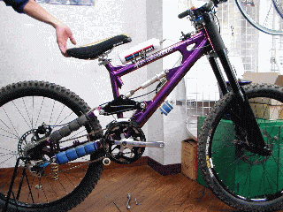 このポジションは標準状態の取り付け位置です。この状態でホイールストローク183o。 なお、フロントフォークはKOWA GISMを使用していますので、標準のMOBSよりヘッドアングルは若干寝ていることになります。フロントタイヤはKUJO TUBELESS。