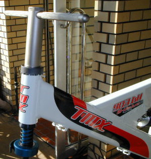 ヘッドパーツ取り付け部もBB部と同様、溶接によるひずみにより変形していたり塗装等によって平行及び平面が正しくでていません。専用工具でヘッド端面と内部を削りピッタリ正確にヘッドパーツ及びフォークを取り付けます。