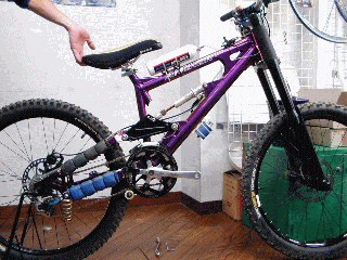 そしてロングストロークポジション。この状態で200oちょっとあると思います。ショートの時と比べると、ショックユニットが一番伸びている状態でBBハイトが高いことがわかります。とは言ってもフレームサイズ400oですから、一般的な体型の方なら多少BBハイトが上がっても取り回しに苦労はしないと思われます。