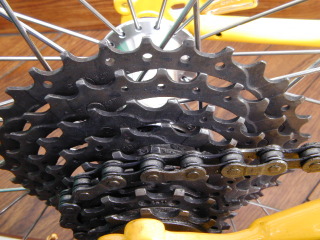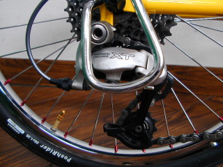 | スプロケはお母さんのお古の8段900XTR。 写真では良くわからないけど、正真正銘のXTR。 そう言うわけで、お母さんは晴れて960の9段XTRにグレードアップ。 蛇足ながらお父さんは8段の737XT。 |
