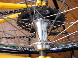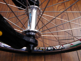 リアホイールもフロントと同じスペックで右タンジェント、左ラジアル組。当然クイック仕様。 そうそう、ニップルはアルミのアルマイトレッド。 |
